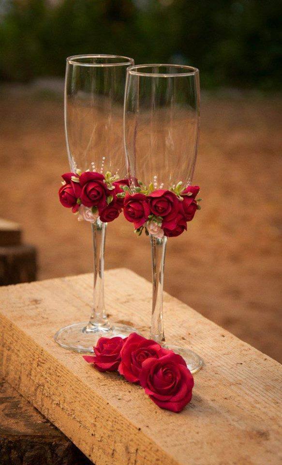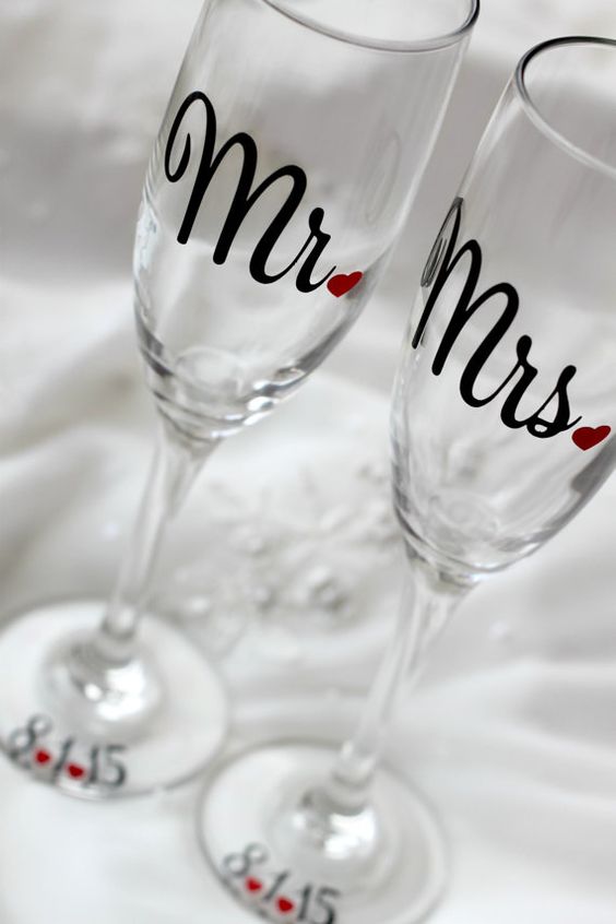 Taças de noivos com aplicações prateadas e o nome dos noivos gravados.