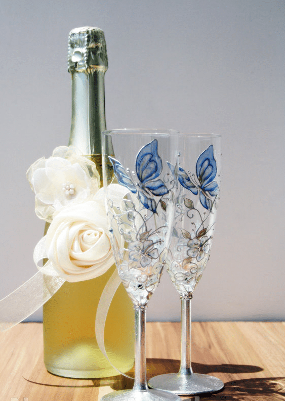Taças de noivos personalizadas com a aplicação de pormenores prateados.